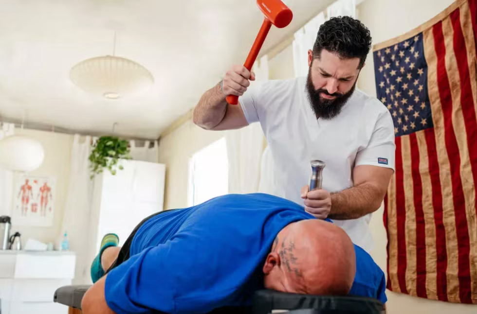 Schon lang gibt es bekanntlich viele Chiropraktiker auf Youtube, in Form von Chiropraktik-Videos von Behandlungen oder Werbung für Praxen. In der Vergangenheit habe ich dies meist ignoriert, da ich dachte, dass solche Leute sich selbst disqualifizieren. Wer würde schon einen Typen ernst nehmen, der, wie auf dem Bild mit dem Hammer auf die Kunden losgeht?